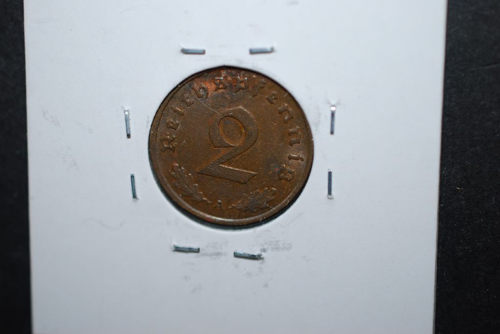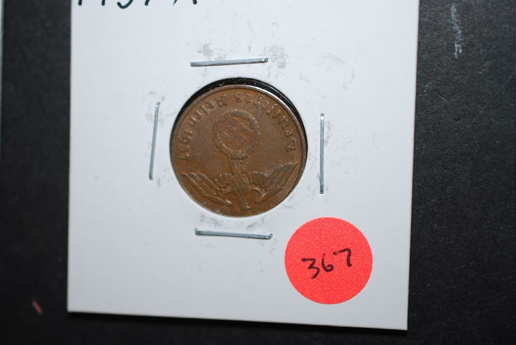 1937-A German 2 Reichspfennig Foreign Coin With Flying Eagle Holding Swatstika; EST. $10-15