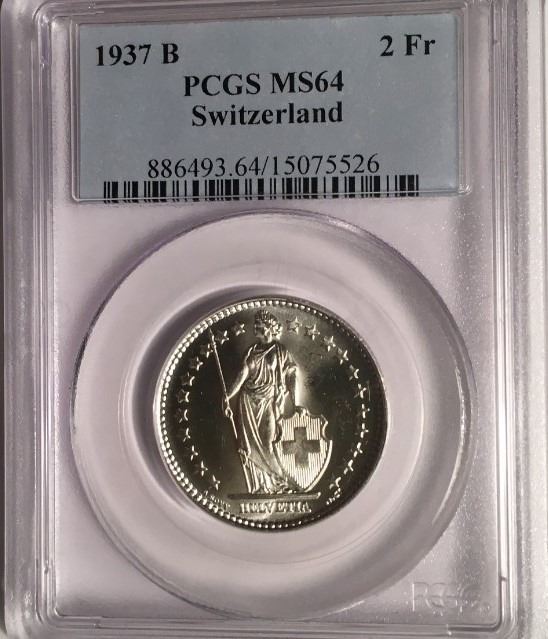 One 1937-B Switzerland 2 Francs PCGS MS64.
