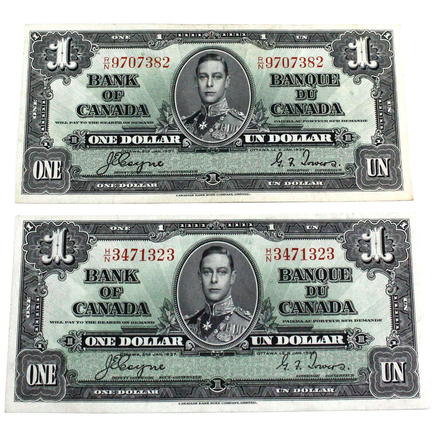 1937 BC-21d Bank of Canada $1 Notes with Coyne-Towers Signatures - R/N9707382 & H/N3471323. 2pcs