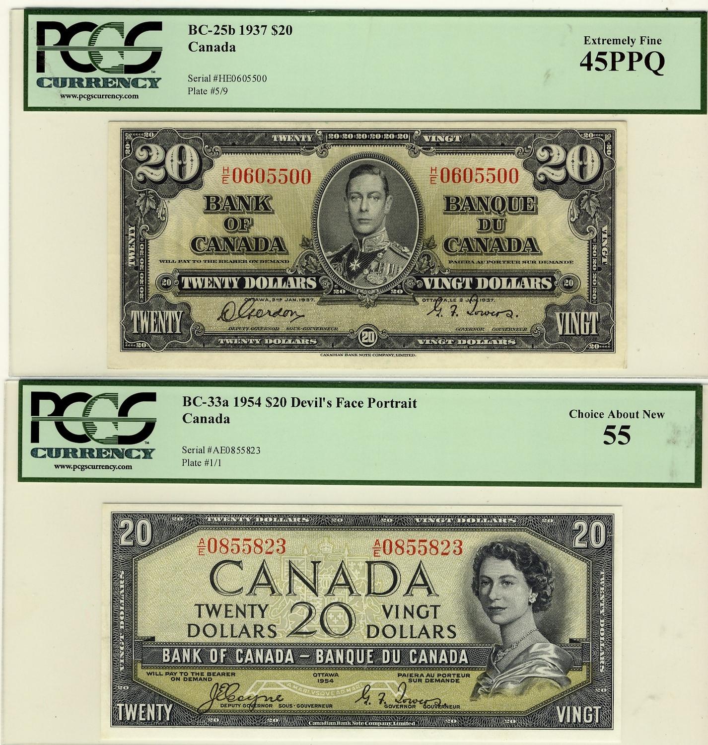 1937 BC-25b $20 #HE0605500 PCGS EF45PPQ & 1954 $20 DF #AE0855823, PCGS AU55. Lot of 2 early $20 issues. Both well centered and clean examples.