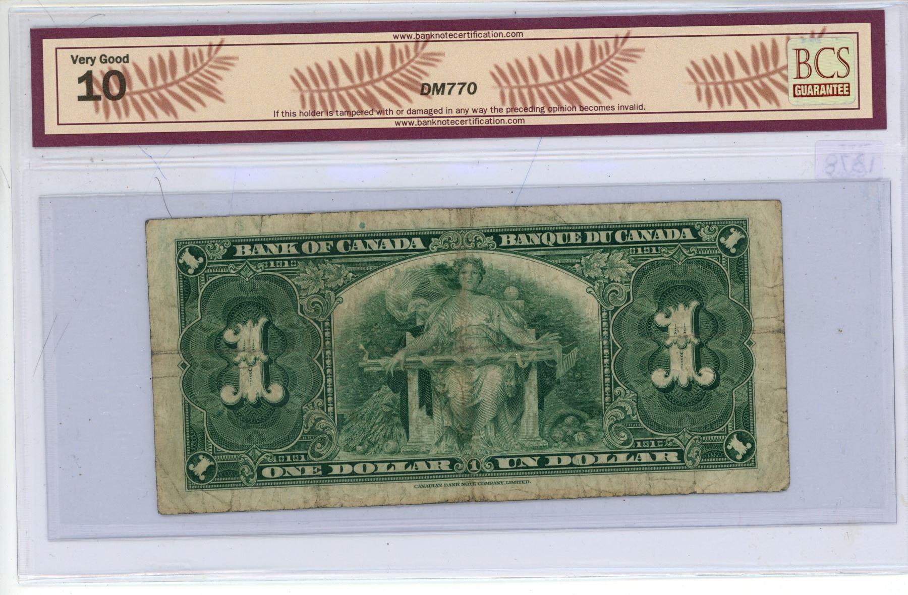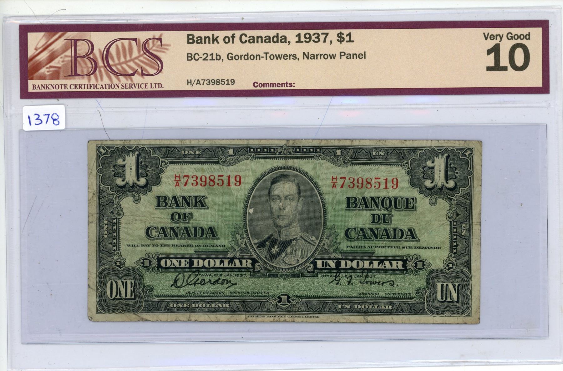 1937 BCS Graded - One Dollar Canadian Bank Note - VG10