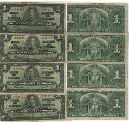 4 King George VI notes; 2xVG & 2xF+. Average circulated condition, light soiling. Serial #'s Y/M0434750; T/N1366695; R/N1257544; and K/N3577575 (no return). Coyne-Towers.