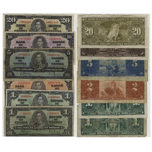1937 Bank of Canada $1,2,5,10, $20-VG/aEF