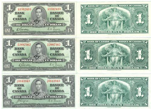3 miscellaneous crisp unc notes. Very fresh color, Gordon-Towers variety BC-21c. Serial #'s C/M1582410, M/M2887362 & Z/M6643943 (no return).