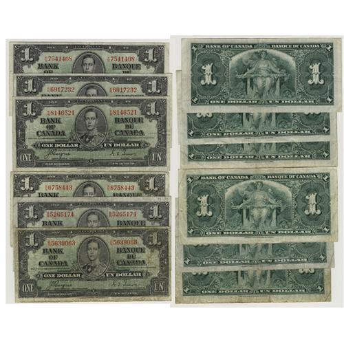 6 King George V notes, Coyne-Towers variety. 1xVG light soiling and minor border tatter, #K/N5639063; 1xFine washed, B/N5265174; and 4xVF mostly fresh with creases, #R/N6758443, K/N8146521, K/N6917232 and K/N7541408. BC-21d, no return.