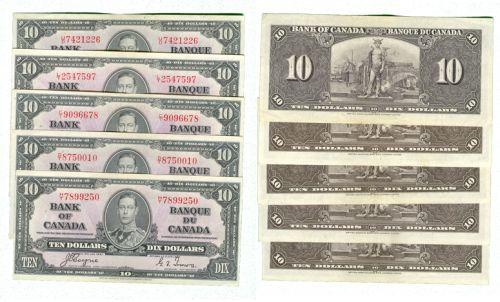 Nice group of 5 fresh King George notes. Light centre crease or fold with a couple of pieces having minor corner pushes. 1xGordon-Towers U/D7421226 and 4x Coyne-Towers (no return).