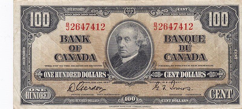 1937 Canadian - Bank of Canada - $100 Bank Note -F+ Condition - Gordon/Towers - B/J Series