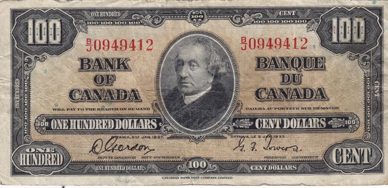 1937 Bank of Canada $100 Bank Note - Gordon / Towers - B/J Series - VF+ Condition