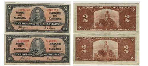 2 King George VI design, Coyne-Towers variety. Fresh color with centre folds (no return). Serial #'s C/R5981773 & J/R1592990 BC-22c.