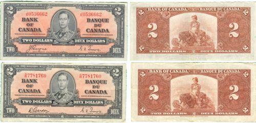 2 pieces; fresh and somewhat crisp. Fresh color with centre folds. 1 each signature variety, Gordon-Towers Serial #S/B7781760 & Coyne-Towers #J/R0536662. BC-22b,c (no return).