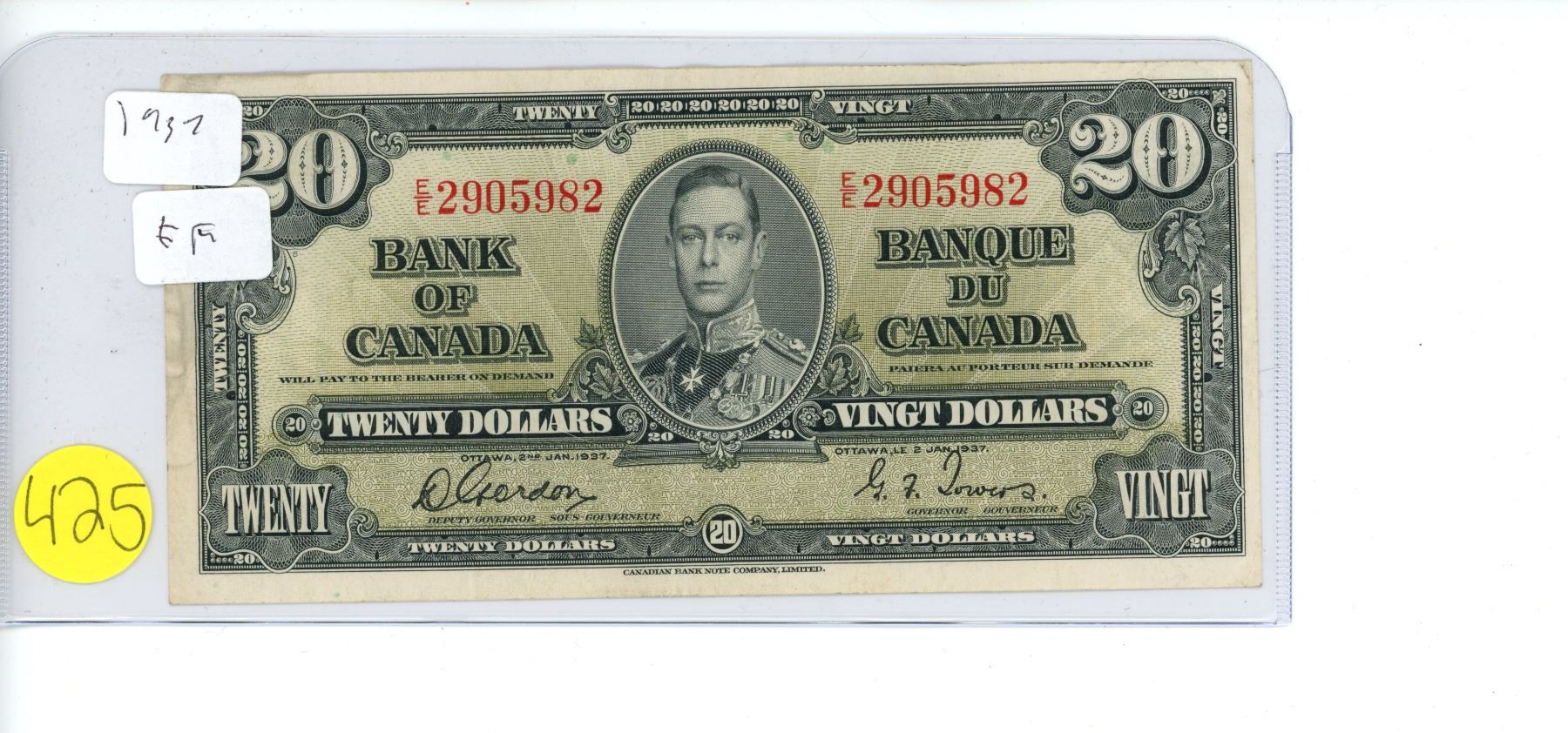 1937 Bank of Canada $20.00 twenty dollar bill E/E prefix