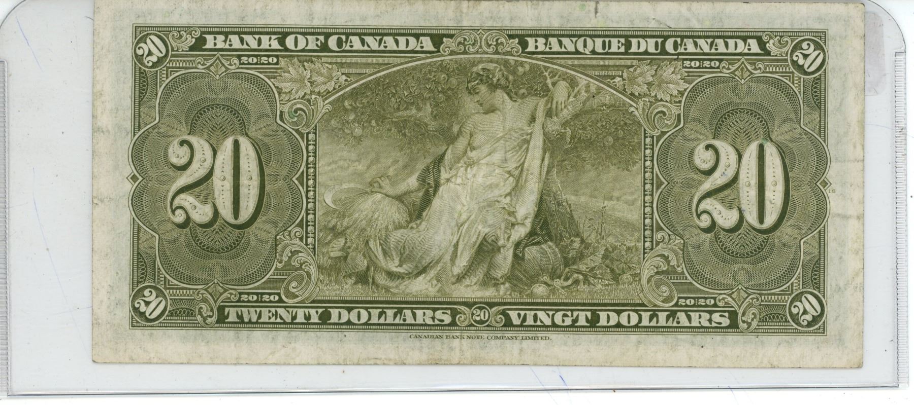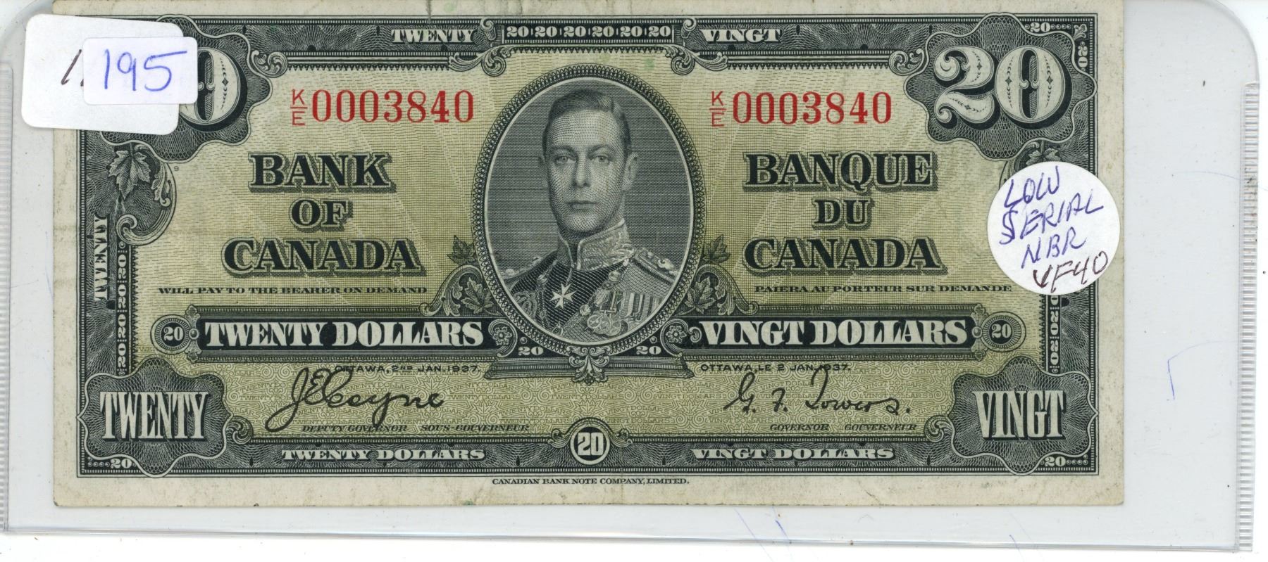 1937 Bank of Canada 20 Dollar Bill - Low Serial Number