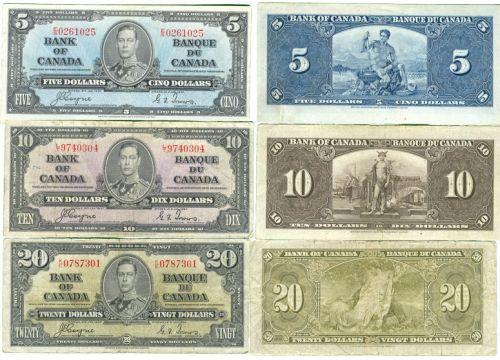 "1937 Bank of Canada $5, $10& $20VG/VF+"