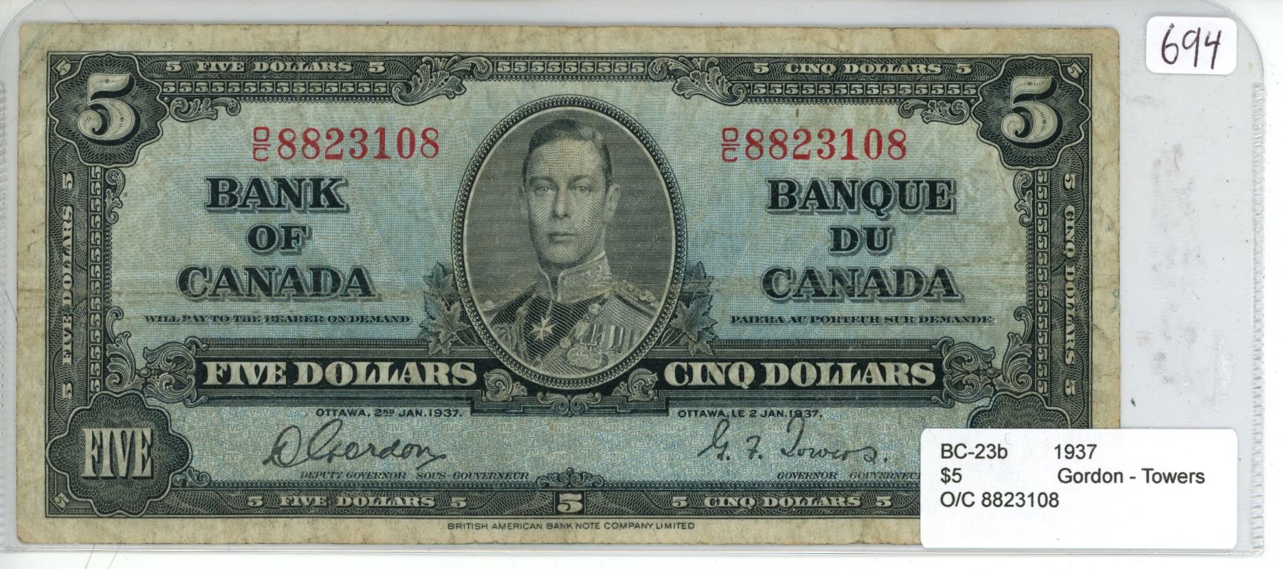1937 Bank of Canada $5, BC-23b, Gordon/Towers, # O/C 8823108