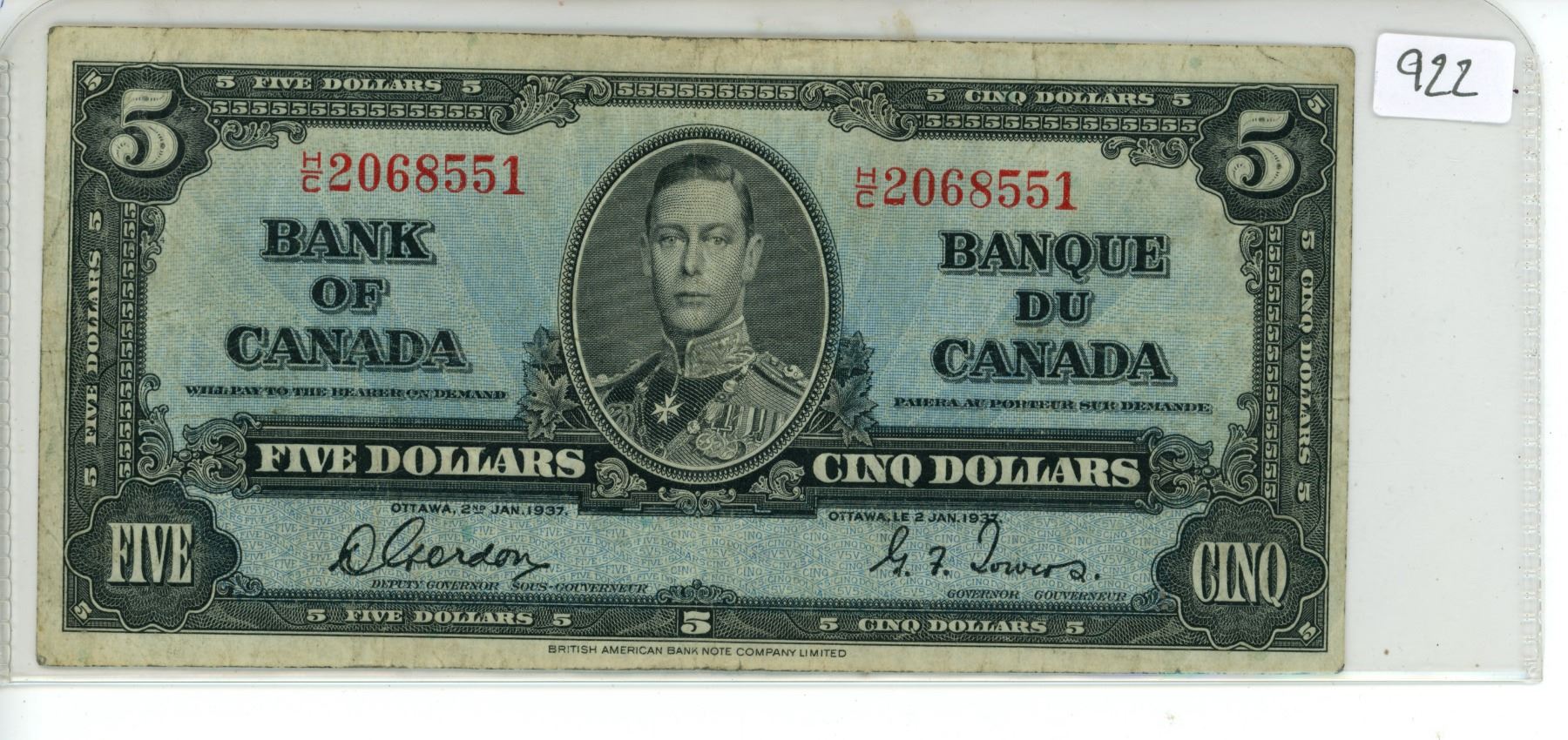 1937 Bank of Canada $5 bill