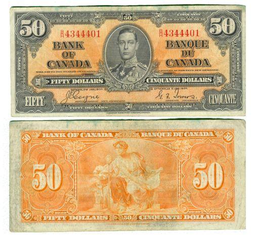 Fresh color and nicely centered. Light bluish stain at the top border. Folds and creases. Serial #B/H4344401 Coyne-Towers, BC-26c.
