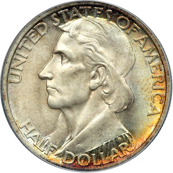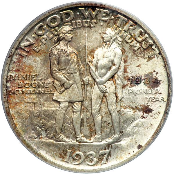1937 Boone Half Dollar. PCGS graded MS-67 CAC Approved. Wonderful multi-color hues, exceptional bold detail on the portrait and standing figures. With smooth-flowing luster on either side. Superb (PCGS # 9270) .