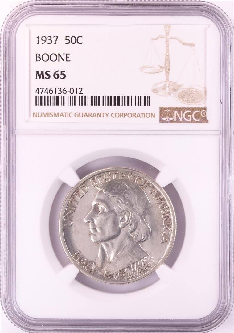 One 1937 Boone Commemorative Half Dollar Coin NGC MS65. NGC Certified.