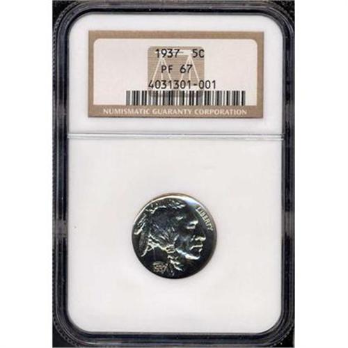 <b>1937 Buffalo Nickel. NGC graded Proof 67.</b> An extremely fresh-looking Proof Buffalo nickel, a coin with superb mirror finish and a wallop from the dies that is amazingly close to perfection. Attractive natural color suggests that the present specimen spent much of its life locked away in an old estate collection where it escaped the coin cleaning craze of the 1970s <b>(PCGS # 3996)</b> <i>