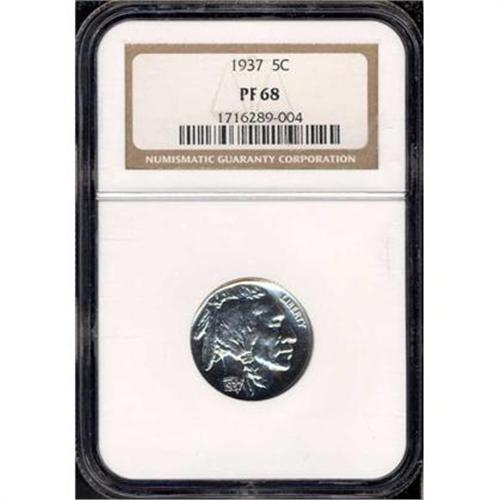 <b>1937 Buffalo Nickel. NGC graded Proof 68.</b> This is a terrific original bright nickel-gray specimen with a faint veil of iridescence on both sides. Well struck for the date, in fact, remarkably sharp even for a Proof, and certainly much better-quality than similar high-grade examples in recent years; we find it justifies strong bidder attention <b>(PCGS # 3996)</b> <i>