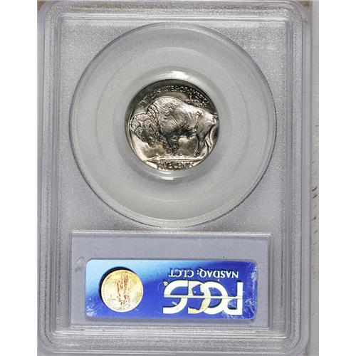 <B>1937<5C> Buffalo Nickel--Struck 5% Off Center--MS62 PCGS.</B></I> The thin unstruck crescent is centered at 7 o'clock on the obverse. Powder-blue and gold toning appears on both sides of this piece.