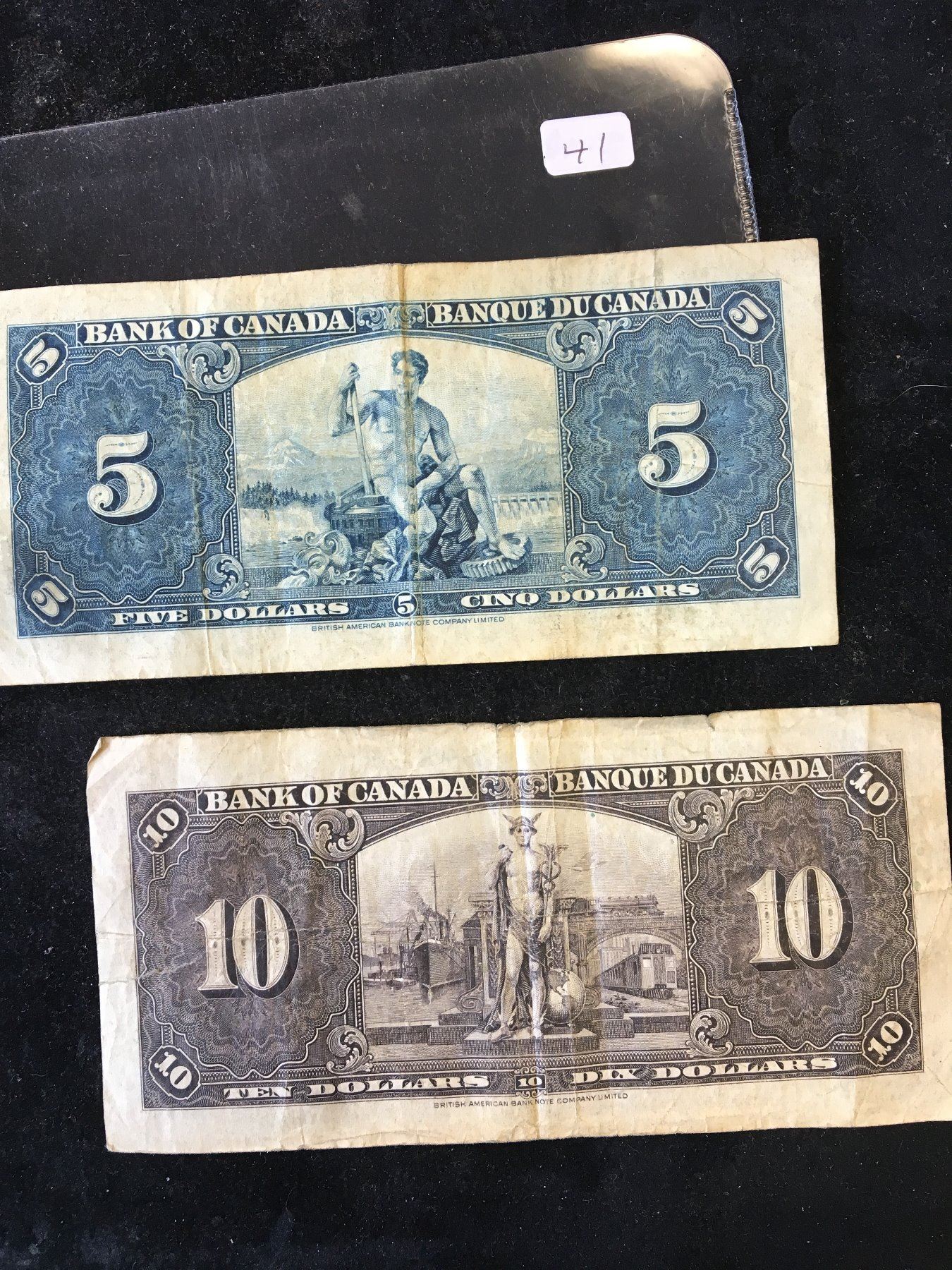 BANK OF CANADA $5 AND $10 NOTES. AVERAGE GRADE,THE $5 HAS INK MARKS AND THE $10 HAS A TEAR.