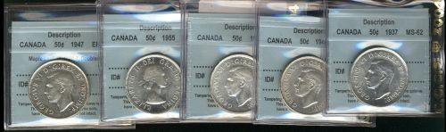1937 CCCS MS-62, 1943 CCCS AU-55, 1944 CCCS AU-55, 1947 ML;S7 Doubled "7" CCCS EF-45, 1955 CCCS MS-63. Lot of 5 pieces.