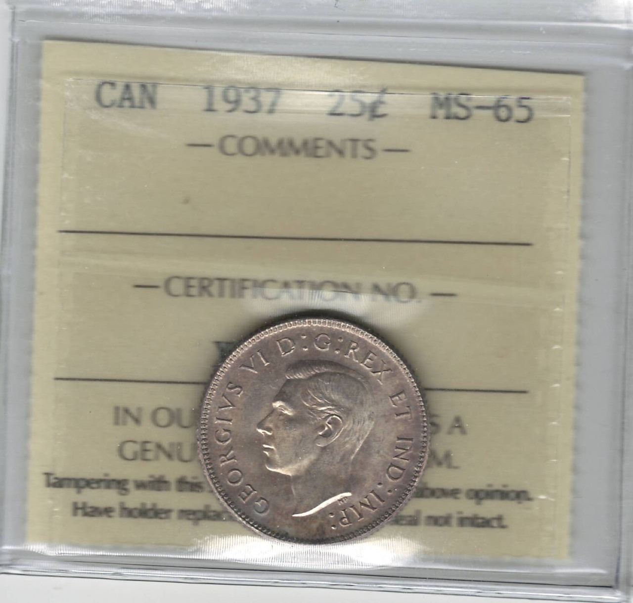 1937 Canada 25 Cent ICCS MS 65