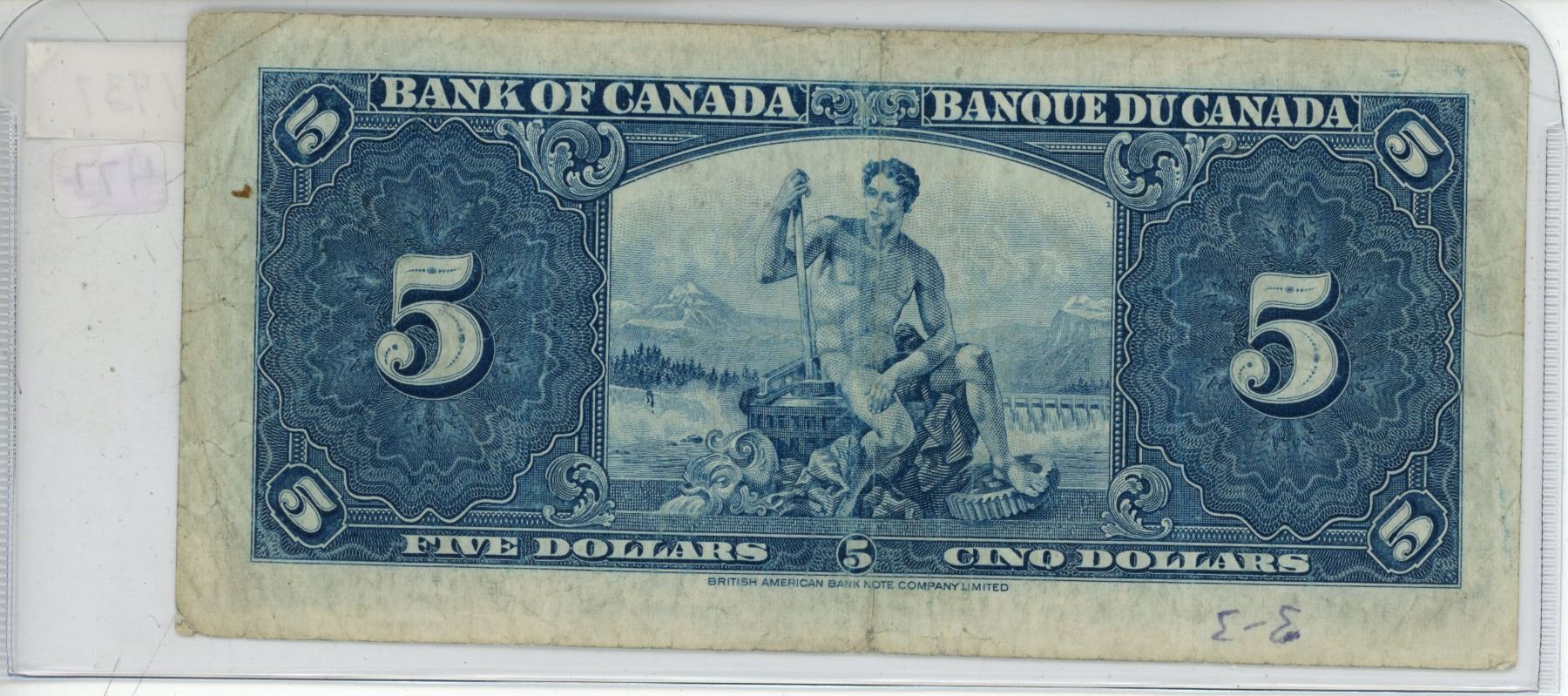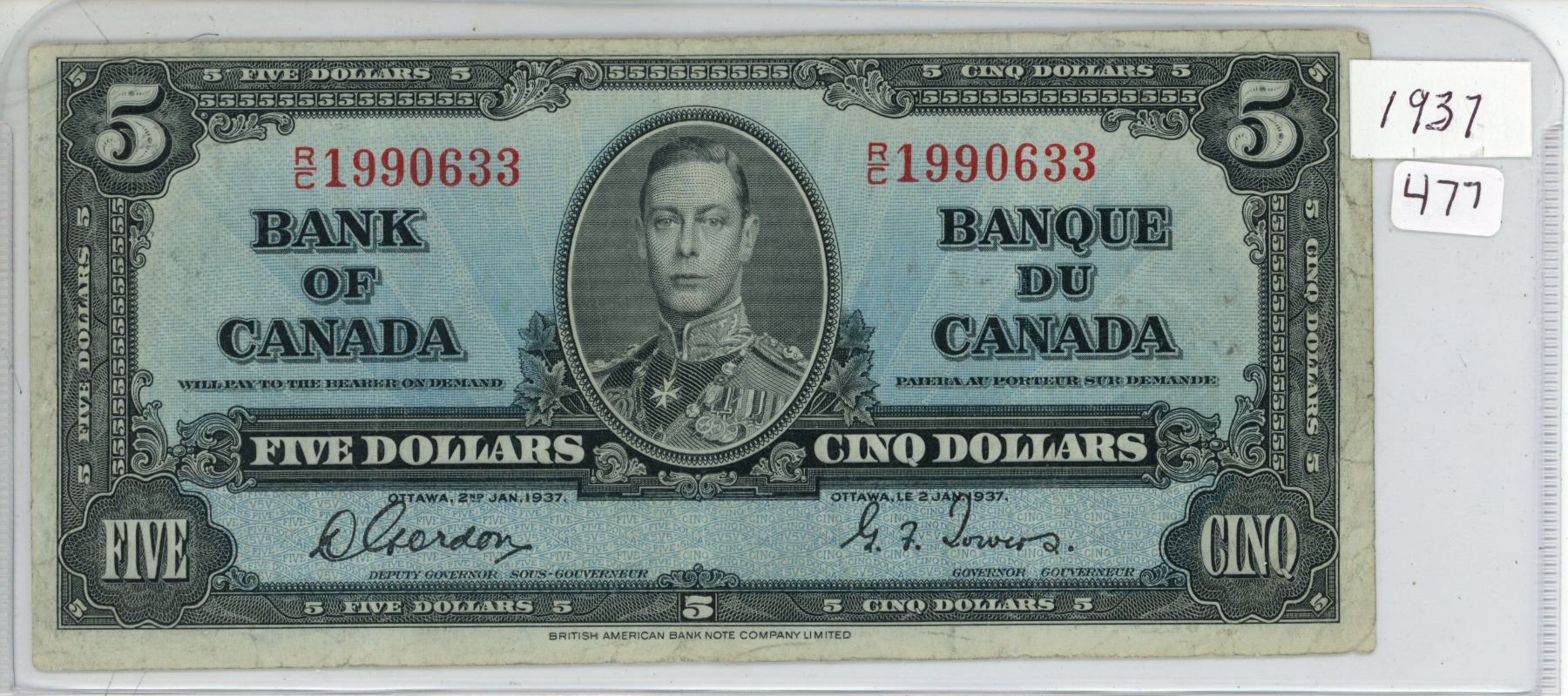 1937 Canadian $5 bill - RC suffix - Gordon/Towers signature