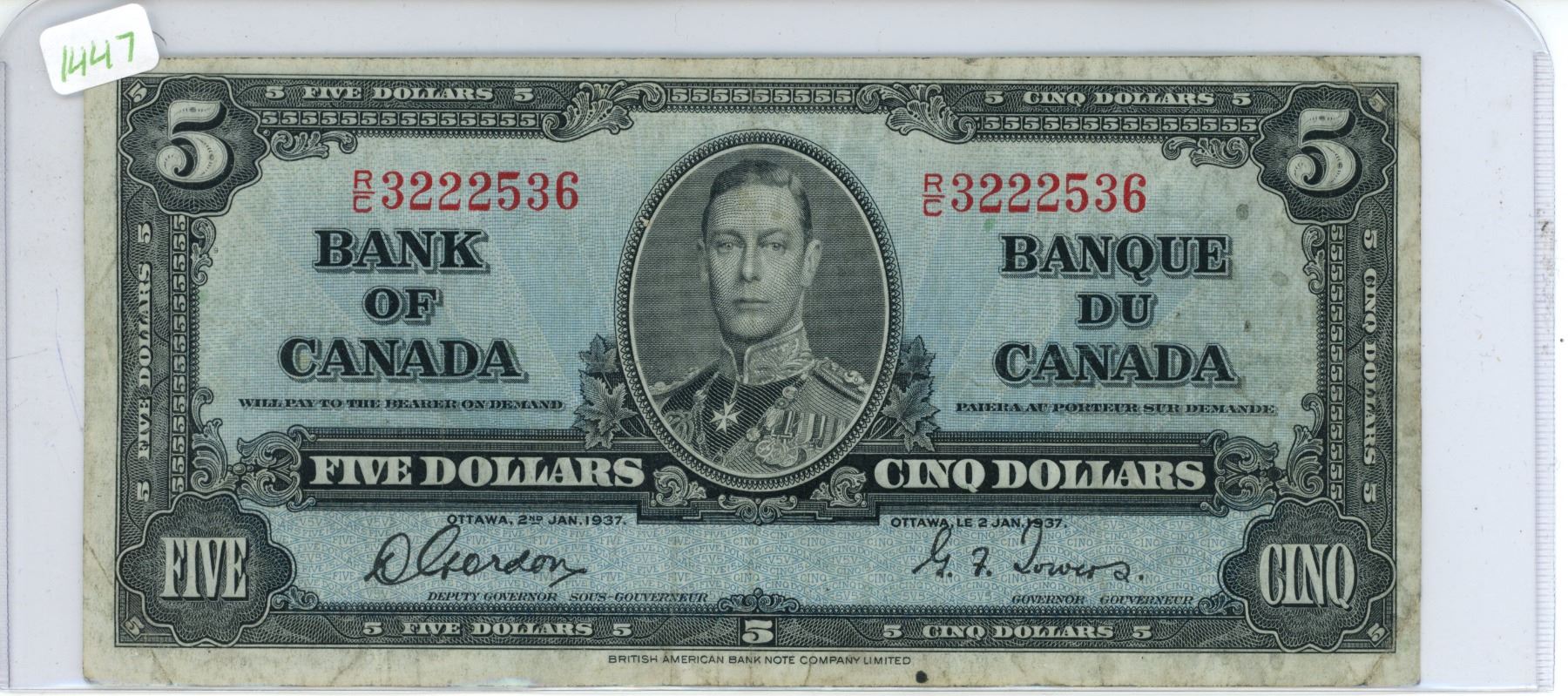 1937 Canadian Five Dollar, Gordon/Towers, R/C 3222536
