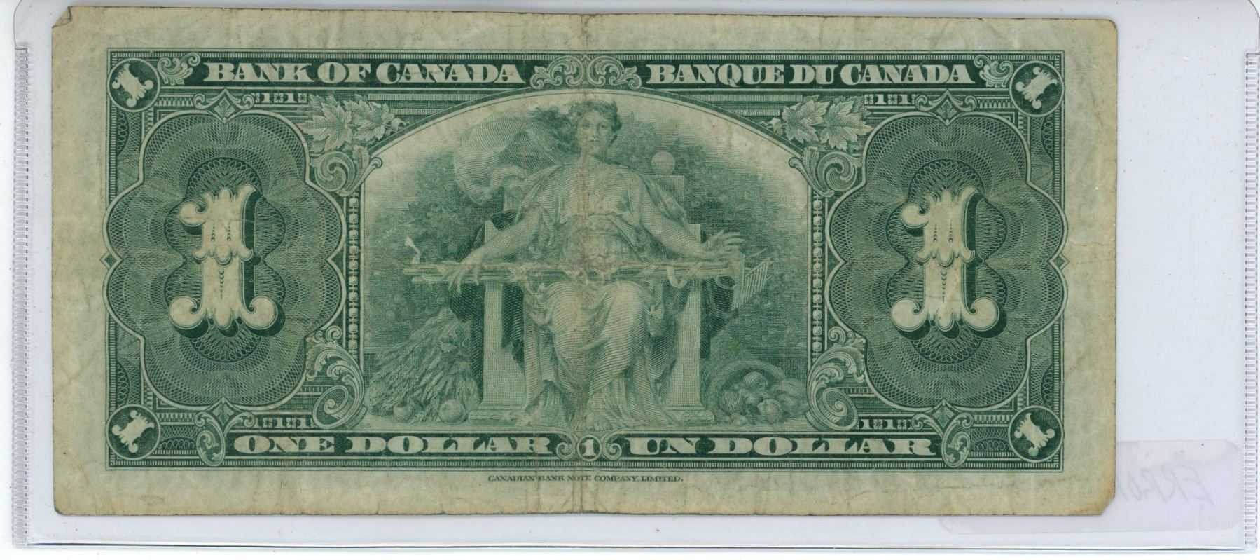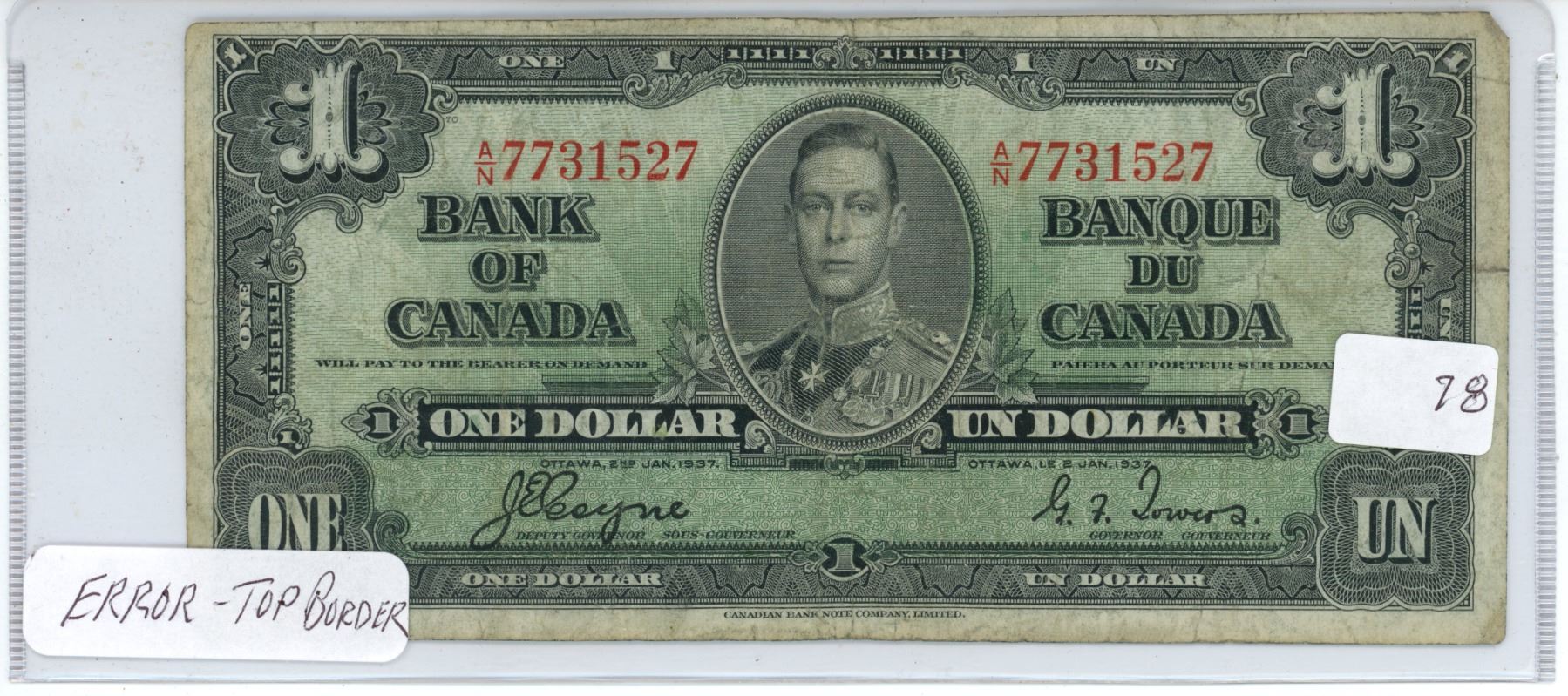 1937 Canadian King George 1 dollar bill - error, top border