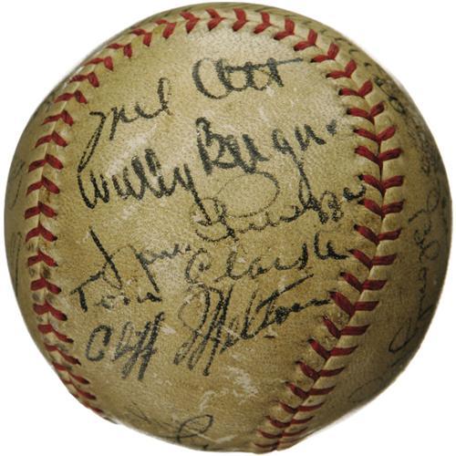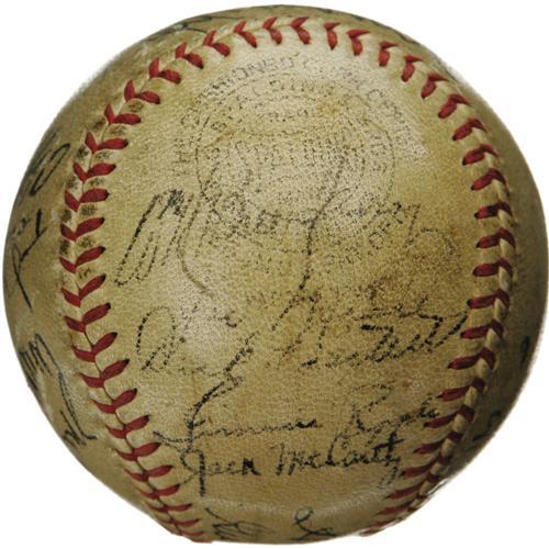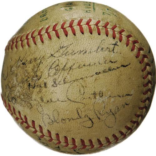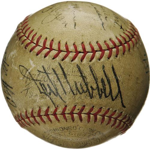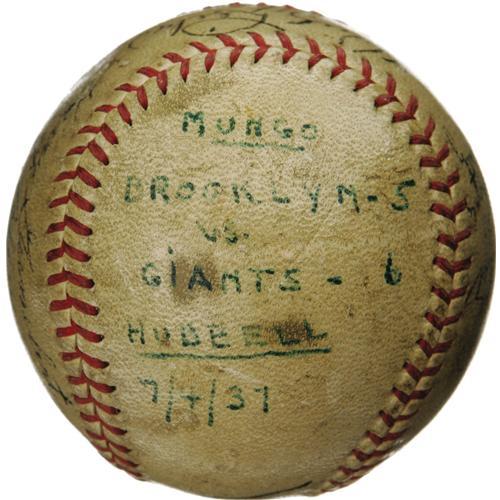 <B>1937 Carl Hubbell Game Used "Win" Baseball Signed by New York Giants Team.</B></I> The Hall of Fame southpaw made use of this ONL (Frick) ball on Independence Day, 1937 as he notched a six to five win over Van Mungo and the Brooklyn Dodgers at Manhattan's Polo Grounds. Hubbell would finish the season with twenty-two wins that season, his second consecutive year atop the National League charts in that category. The side panel block lettered notation, believed to be in Hubbell's own hand, is joined by the autographs of eighteen Giants, including a 10/10 monster of a signature from Hubbell himself over the ball's stamping. Also here is Ott (10/10), Terry (6/10), Schumacher, Gumbert and more. Average quality is 7/10. What lucky collector will help this ball celebrate its seventieth birthday on the Fourth of July this year? <I>LOA from PSA/DNA. LOA from James Spence Authentication.</B></I><BR><BR><b>Shipping:</b> Balls, Pucks, etc., Small (<a target="_blank" href="http://www.heritageauctions.com/common/shipping.php">view shipping information</a>)