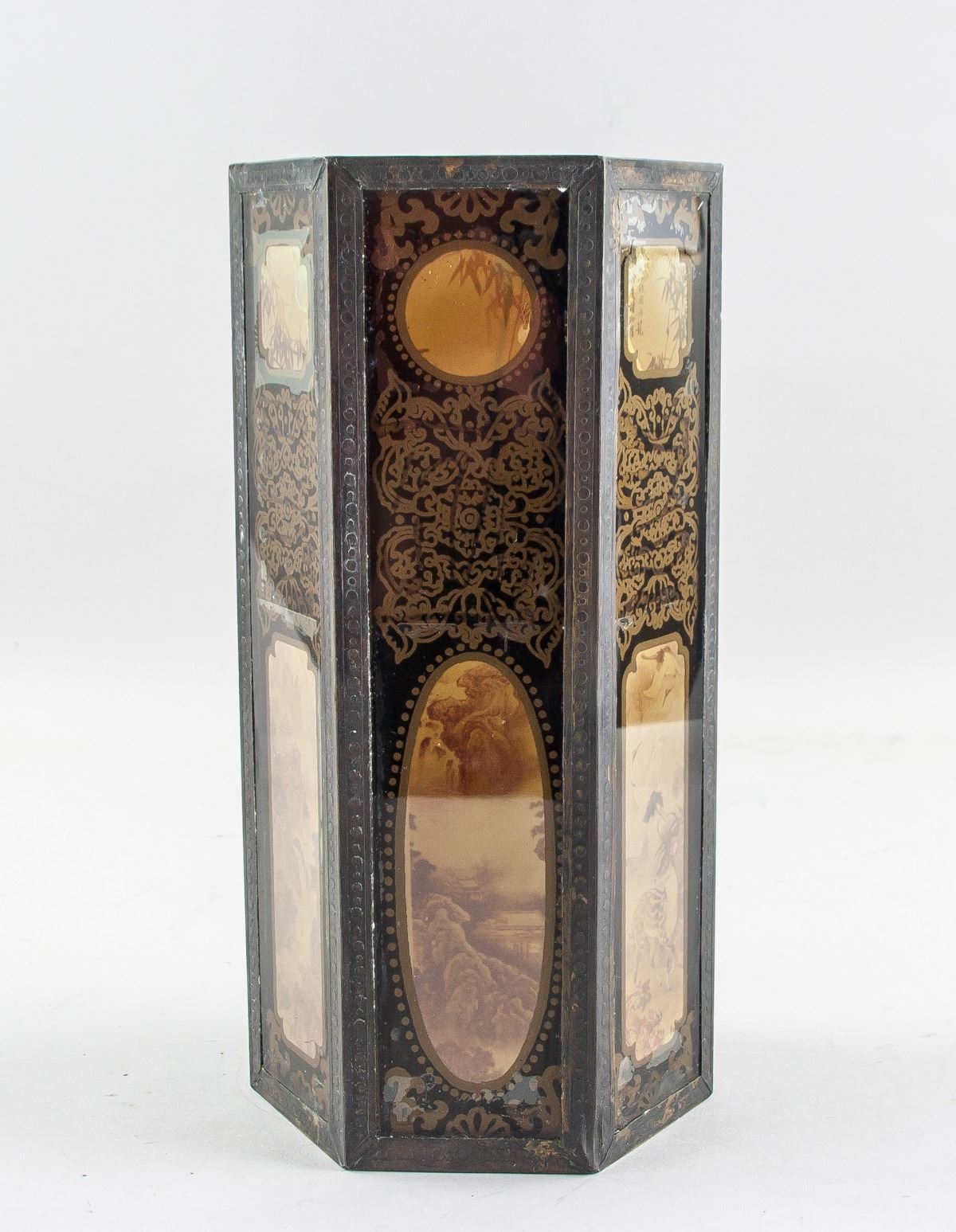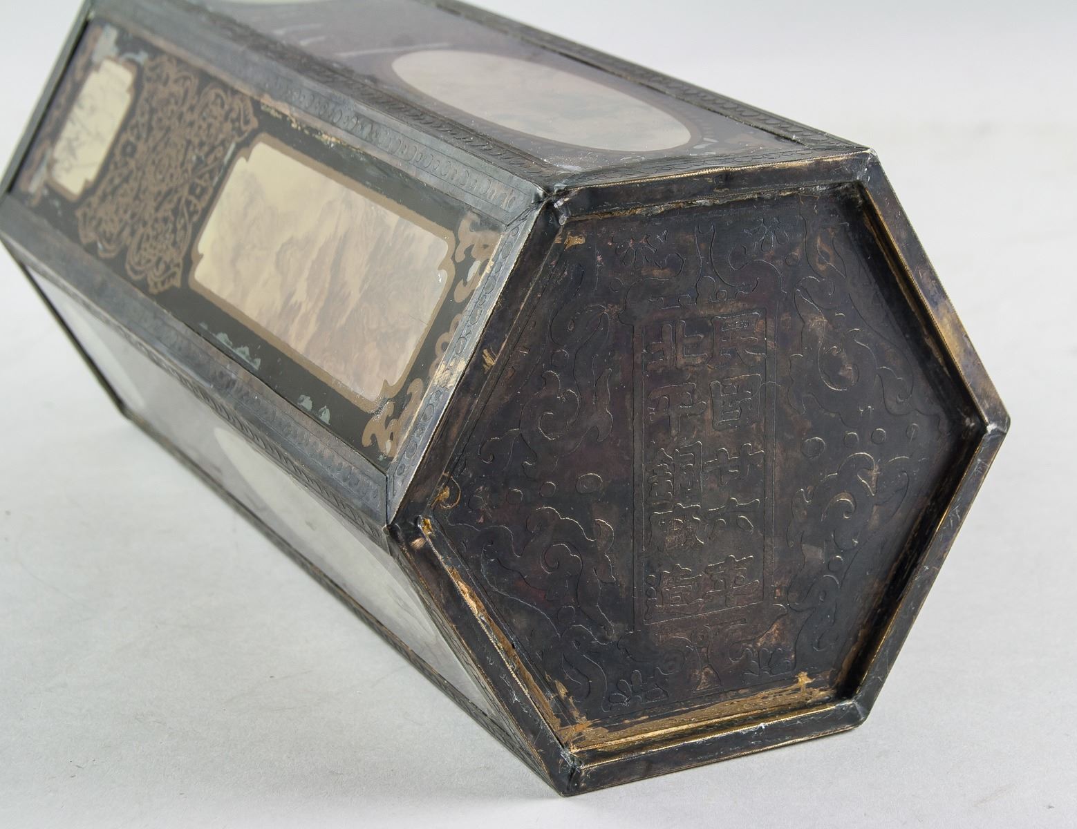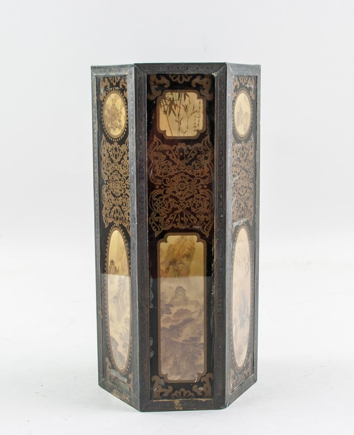Vintage 1937 Chinese bronze and glass brush pot, featuring hexagon form body, with reverse painting mountainous landscape and bamboo, ten-character mark on base lettering Min Guo Nian Liu Nian (Republic 26 Year, 1937) Bei Ping Tong Chang Zao, 26 x 12 cm, 1398 grams