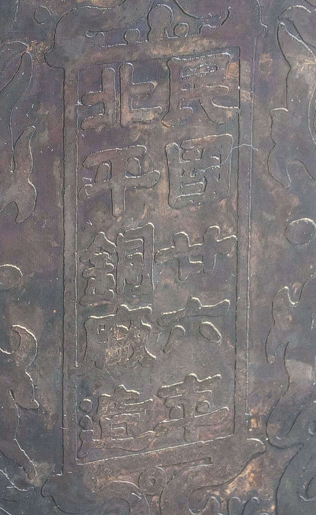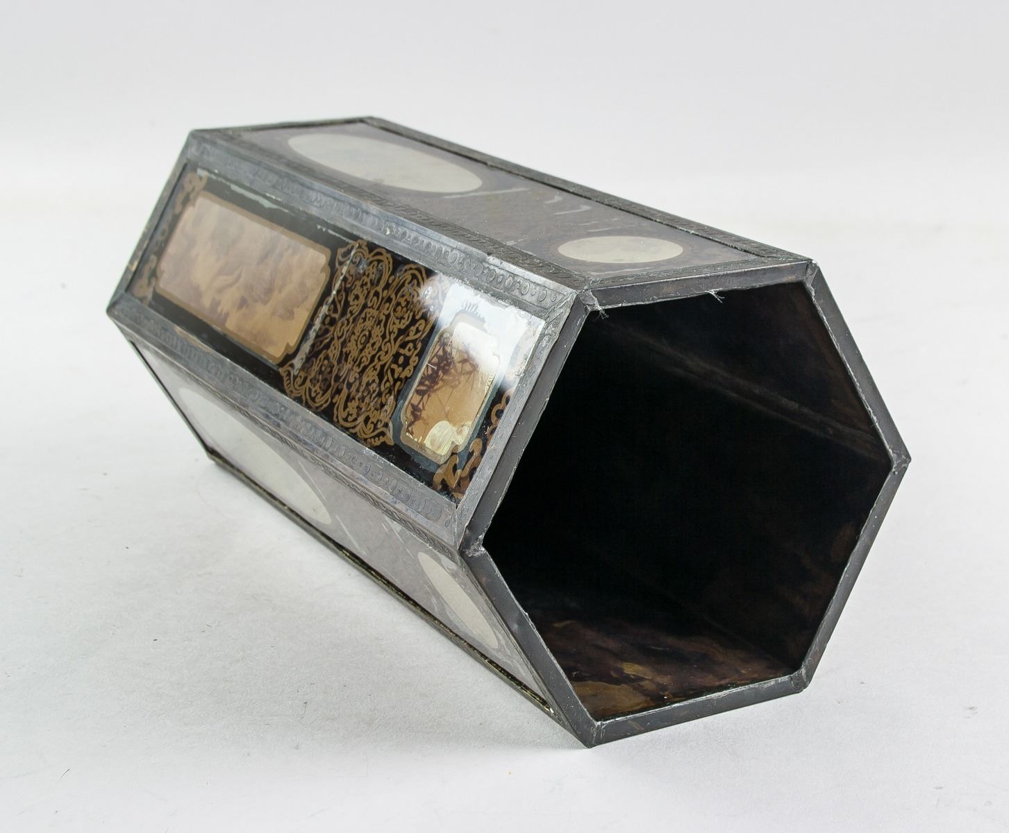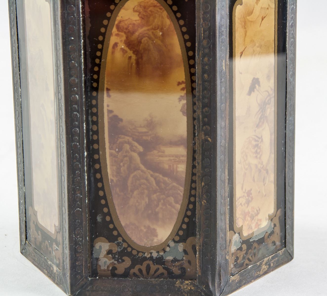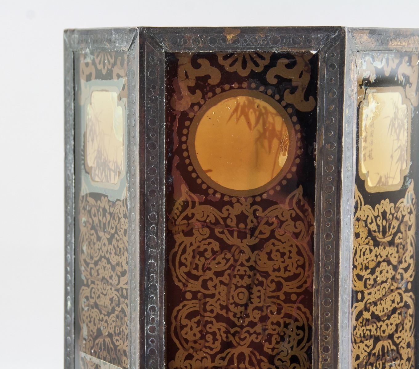 Vintage 1937 Chinese bronze and glass brush pot, featuring hexagon form body, with reverse painting mountainous landscape and bamboo, ten-character mark on base lettering Min Guo Nian Liu Nian (Republic 26 Year, 1937) Bei Ping Tong Chang Zao, 26 x 12 cm, 1398 grams