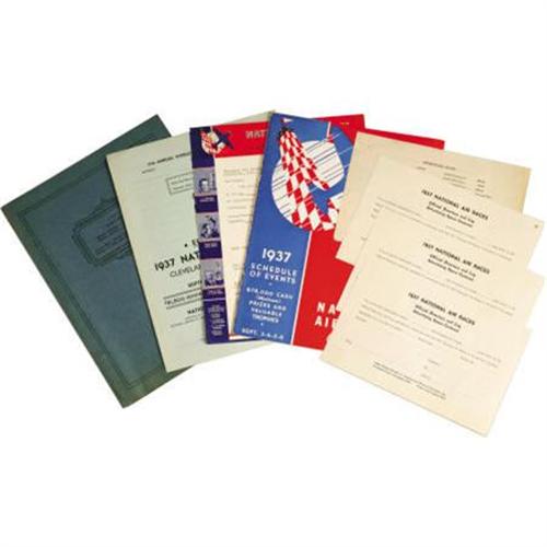 <B>1937 Cleveland Air Races Archive</B></I> including a copy of the official schedule of events, 8.5” x 11”, 16 pages, paper covers, in fine condition; a sales and expense report for the race, 9” x 11.5”, 35 page, bound with brads into a paper folder, in very good condition; an entry blank for the race, an advertising rate sheet and advertising contracts for the event, in very good condition. <I>From the collection of Cliff Henderson.</B></I><BR><BR><b>Shipping:</b> Books & Catalogs (<a target="_blank" href="http://www.heritageauctions.com/common/shipping.php">view shipping information</a>)