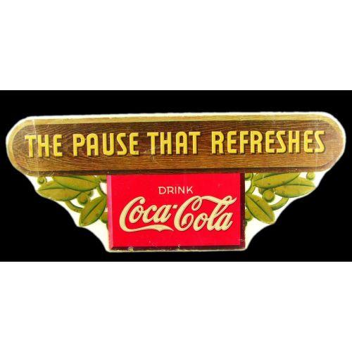 1937 Coca Cola Die Cut Cardboard Sign, The Pause the Refreshes. Scuff, paper loss, creases, edge ware and minor stains otherwise fair to good condition. 33 1/2 X 13 1/2 inches.