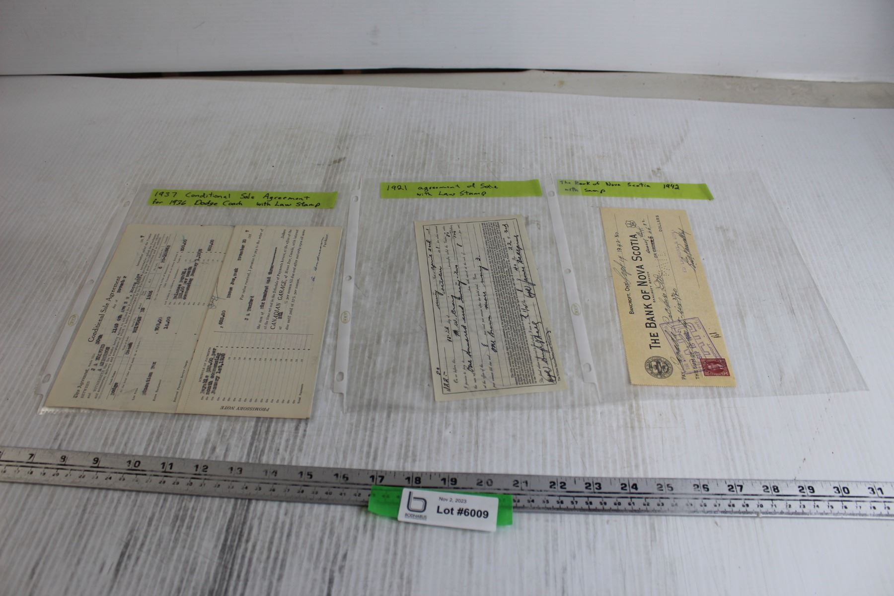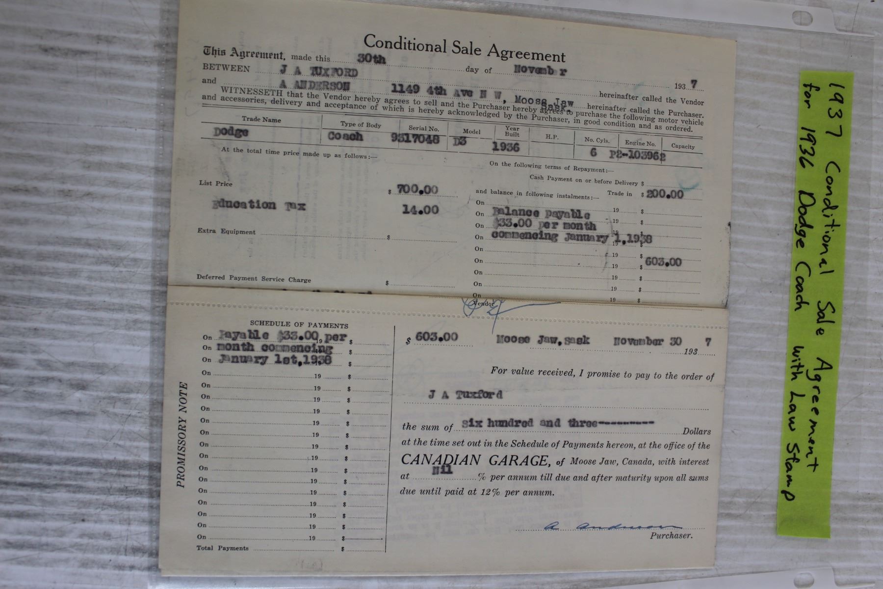 1937 Conditional Sale Agreement for 1936 Dodge Coach with Law Stamp, 1921 Agreement of Sale with Law Stamp, The Book of Nova Scotia 1942 with Stamp