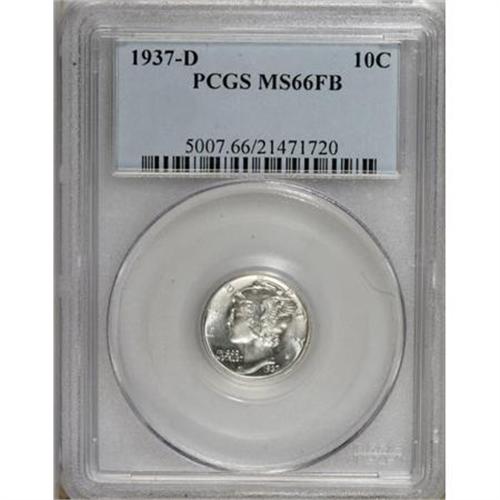 <B>1937-D 10C MS66 Full Bands PCGS.</B></I> PCGS Population (481/197). NGC Census: (257/144). Mintage: 14,146,000. Numismedia Wsl. Price for NGC/PCGS coin in MS66: $140. (#5007)<BR><BR><B>Coin Engraver:</B> Adolph A. Weinman<BR><BR><b>Shipping:</b> Coins & Currency (<a target="_blank" href="http://www.heritageauctions.com/common/shipping.php">view shipping information</a>)