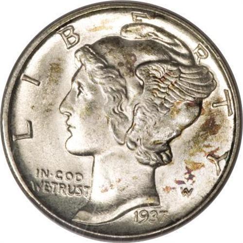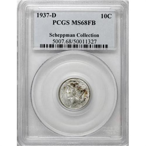 <B>1937-D 10C MS68 Full Bands PCGS.</B></I> Ex: Stokely Collection. Sprays of olive, crimson, and russet iridescence are seen on each side of this expertly preserved coin, with pearl-gray as the most prominent shade on each side. Underlying mint frost adds remarkable vibrancy to the patina. Boldly struck with superb overall surfaces that show no evidence of a blemish, though faint die striations (as struck) are visible under magnification. This magnificent Superb Gem represents unsurpassable quality for this date and mint. Neither NGC nor PCGS has graded a finer Full Bands example (12/07).<BR><I>From The Scheppman Collection, #4 PCGS Registry of Full Band Mercury Dimes.</B></I><BR><BR><B>Coin Engraver:</B> Adolph A. Weinman<BR><BR><b>Shipping:</b> Coins & Currency (<a target="_blank" href="http://www.heritageauctions.com/common/shipping.php">view shipping information</a>)