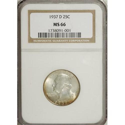 <B>1937-D 25C MS66 NGC.</B></I> NGC Census: (135/16). PCGS Population (235/26). Mintage: 7,189,600. Numismedia Wsl. Price for NGC/PCGS coin in MS66: $320. (#5804)<BR><BR><B>Coin Engraver:</B> John Flanagan<BR><BR><b>Shipping:</b> Coins & Currency (<a target="_blank" href="http://www.heritageauctions.com/common/shipping.php">view shipping information</a>)