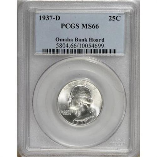 <B>1937-D 25C MS66 PCGS.</B></I> Ex: Omaha Bank Hoard. PCGS Population (216/26). NGC Census: (132/16). Mintage: 7,189,600. Numismedia Wsl. Price for NGC/PCGS coin in MS66: $320. (#5804)<BR><BR><b>Shipping:</b> Coins & Currency (<a target="_blank" href="http://www.heritageauctions.com/common/shipping.php">view shipping information</a>)
