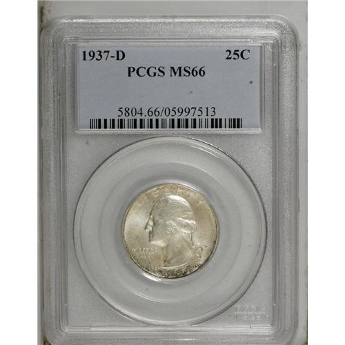 <B>1937-D 25C MS66 PCGS.</B></I> Speckled russet toning is present at the lower obverse. Lustrous and well struck with a thin coat of blue and tan patina over both sides.<BR><BR><b>Shipping:</b> Coin/Currency (<a target="_blank" href="http://www.heritageauctions.com/common/shipping.php">view shipping information</a>)
