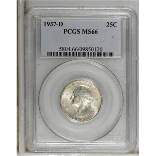 <B>1937-D 25C MS66 PCGS.</B></I> PCGS Population (216/26). NGC Census: (133/16). Mintage: 7,189,600. Numismedia Wsl. Price for NGC/PCGS coin in MS66: $320. (#5804)<BR><BR><B>Coin Engraver:</B> John Flanagan<BR><BR><b>Shipping:</b> Coins & Currency (<a target="_blank" href="http://www.heritageauctions.com/common/shipping.php">view shipping information</a>\)