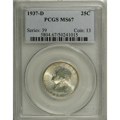 <B>1937-D 25C MS67 PCGS.</B></I> A blazing Superb Gem that boasts thick luster and a strong strike. The surfaces are close to pristine, and only lemon-lime tints here and there deny full brilliance. Like all branch mint Washington quarters from the 1930s, the 1937-D is challenging to find at the MS67 level. Population: 26 in 67, 0 finer (1/07).<BR><BR><b>Shipping:</b> Coins & Currency (<a target="_blank" href="http://www.heritageauctions.com/common/shipping.php">view shipping information</a>)