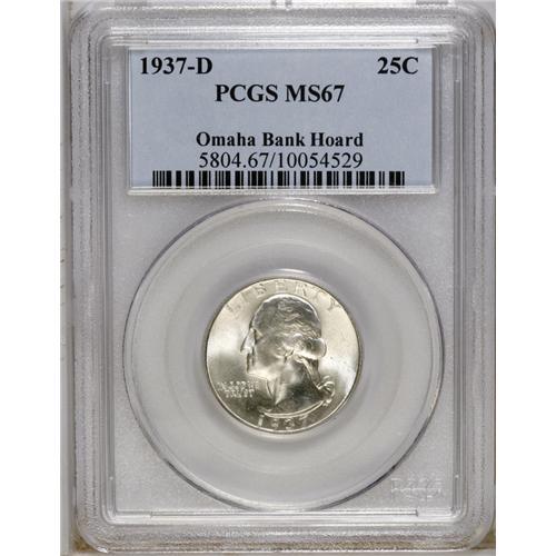 <B>1937-D 25C MS67 PCGS.</B></I> Ex: Omaha Bank Hoard. Well struck and untoned, with unusually frosty luster for the type, and well preserved surfaces that are nearly pristine. Two or three tiny nicks, on and just beneath the eagle's left (facing) wing, fail to impede either the eye appeal or the technical grade of this lovely Washington quarter. Population: 26 in 67, 0 finer (2/07).<BR><BR><b>Shipping:</b> Coins & Currency (<a target="_blank" href="http://www.heritageauctions.com/common/shipping.php">view shipping information</a>)