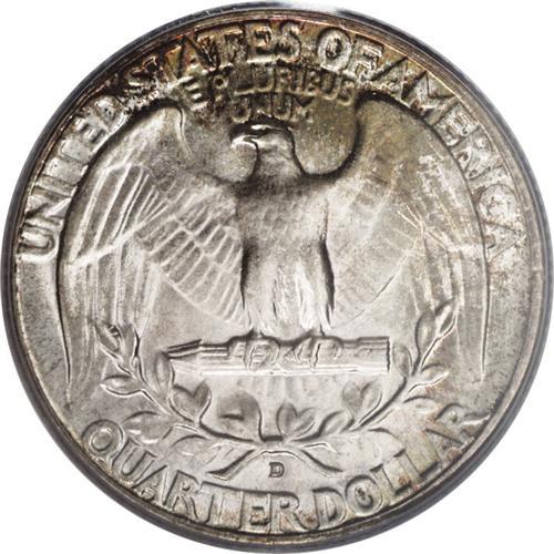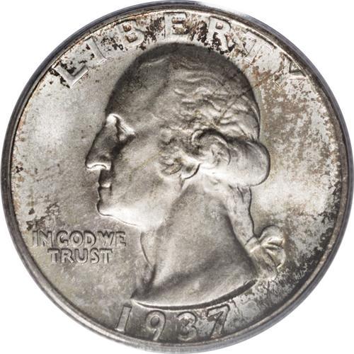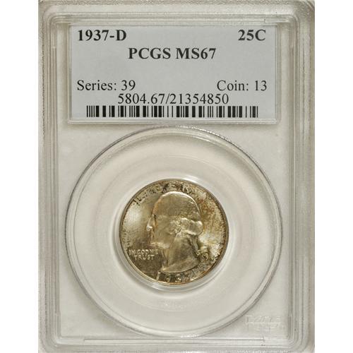 <B>1937-D 25C MS67 PCGS.</B></I> The softly lustrous silver-gray surfaces display zones of dappled amber-gold patina in the right obverse field and at the upper reverse. Well-defined and carefully preserved. While the 1937-D has a middle-of-the-road mintage of just under 7.2 million pieces, Superb Gems are conditionally rare, and anything finer is unknown. Tied for the finest certified by PCGS (4/07).<BR><BR><b>Shipping:</b> Coins & Currency (<a target="_blank" href="http://www.heritageauctions.com/common/shipping.php">view shipping information</a>)