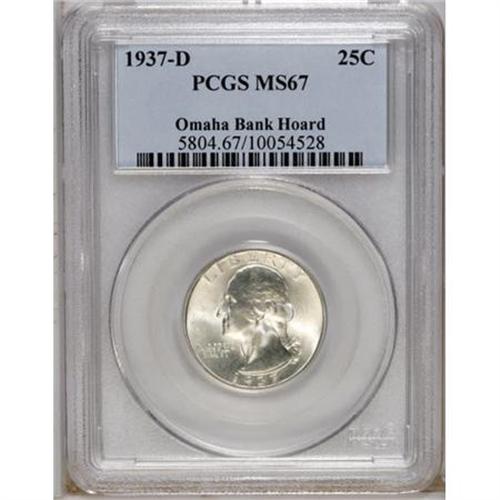 <B>1937-D 25C MS67 PCGS.</B></I> Ex: Omaha Bank Hoard. A captivating example of this early D-mint issue, strongly lustrous with a faint aura of frost on the obverse. Crisply struck with gold-tinged haze in the fields that yields to essentially untoned centers. The 1937-D is surprisingly elusive in higher grades, with just 42 pieces assigned Superb Gem status between NGC and PCGS with none finer (5/07).<BR><BR><B>Coin Engraver:</B> John Flanagan<BR><BR><b>Shipping:</b> Coins & Currency (<a target="_blank" href="http://www.heritageauctions.com/common/shipping.php">view shipping information</a>\)