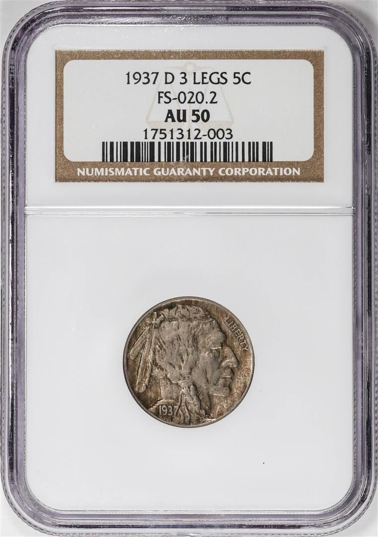One 1937-D 3 Legged Buffalo Nickel Coin NGC AU50 FS-020.2. NGC Certified.