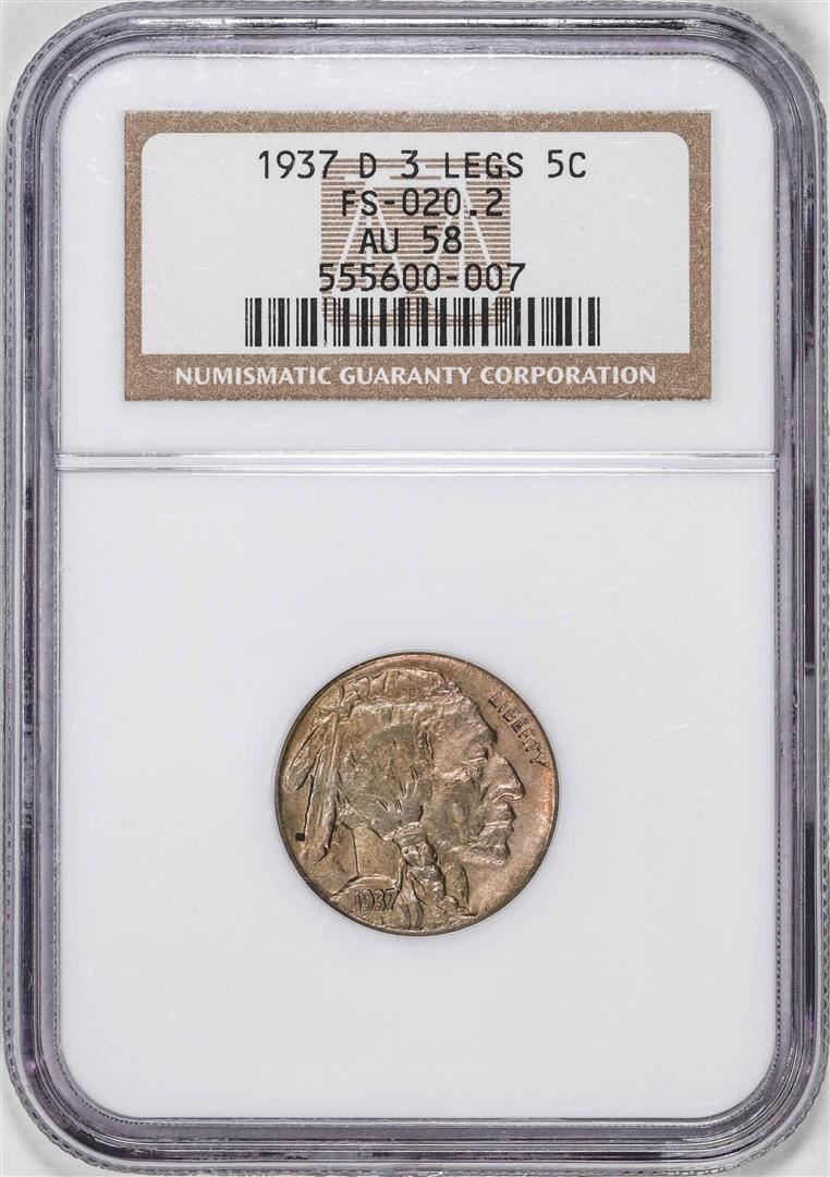 One 1937-D 3 Legged Buffalo Nickel Coin NGC AU58 FS-020.2 Nice Color. NGC Certified.