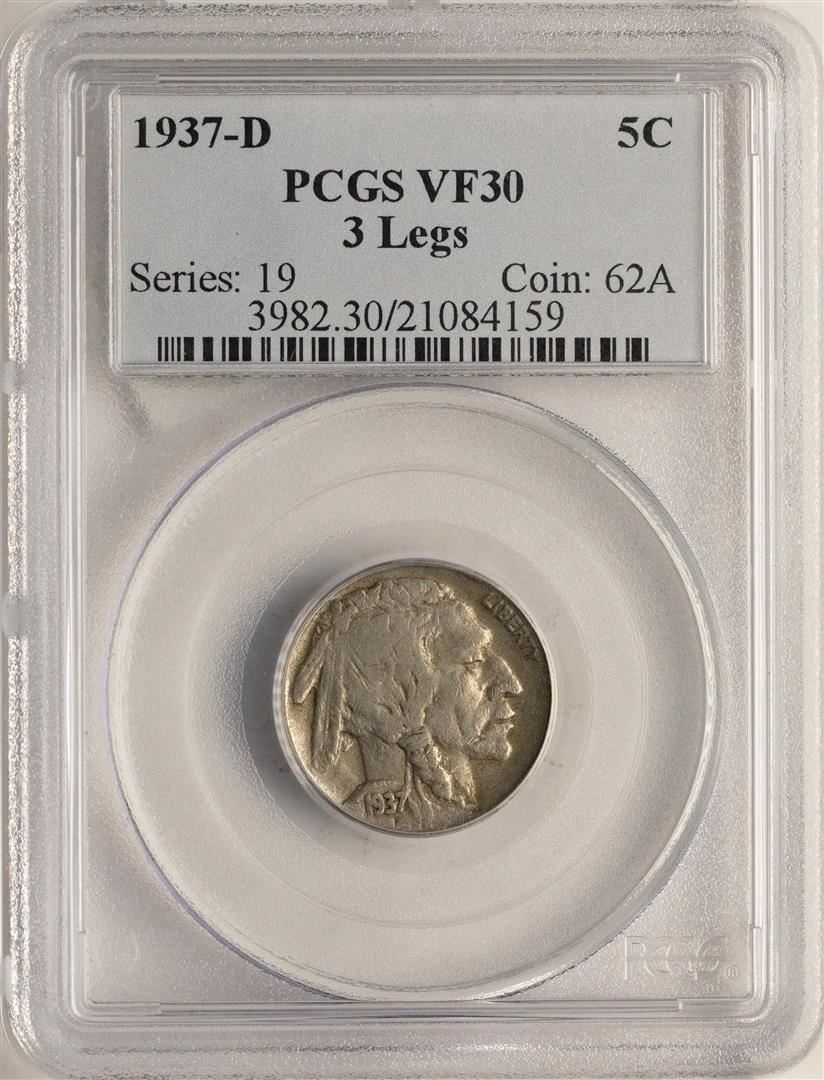 One 1937-D 3 Legged Buffalo Nickel Coin PCGS VF30. PCGS Graded.